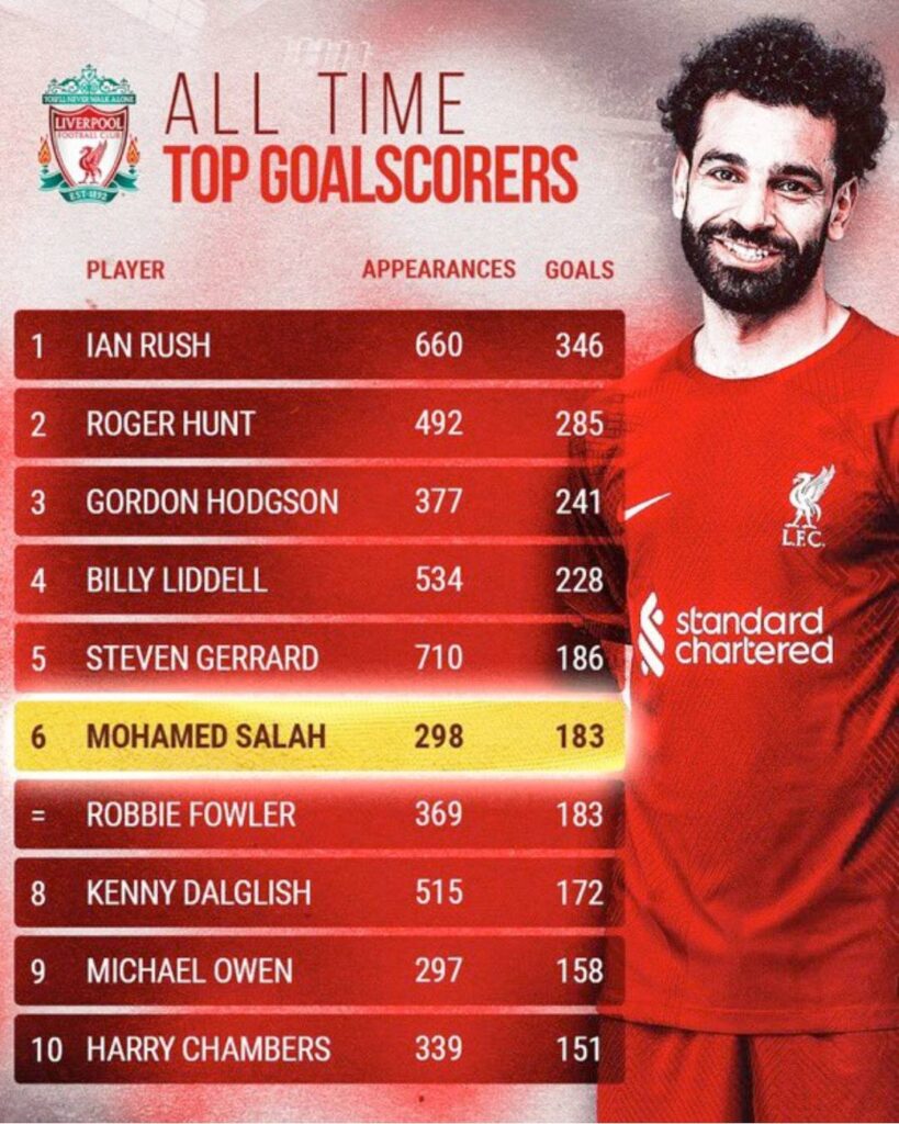 ဆာလာဟာ နော်တင်ဟမ်ဖောရတ်နဲ့ပွဲမှာ အဆုံးအဖြတ်ဂိုးကို သွင်းယူခဲ့ပြီးနောက် လီဗာပူးရဲ့ ထာဝရ ထိပ်တန်းဂိုးသွင်းရှင် စာရင်းမှာ နံပါတ် ၆ နေရာကို အဆင့်တက်လာခဲ့ပါတယ်။
