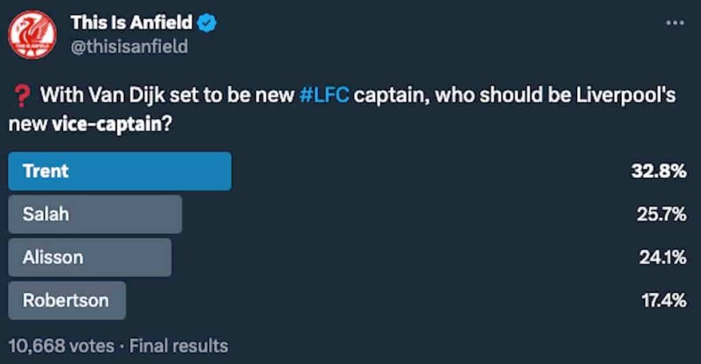 များစွာသော လီဗာပူးဖန်ဆိုဒ်တွေက ပရိသတ် စစ်တမ်းတွေကို လိုက်လံ ကောက်ယူခဲ့ကြချိန်မှာ ဗန်ဒိုက်ကို အသင်းခေါင်းဆောင်အဖြစ် နှစ်အနည်းငယ် တာဝန်ယူစေဖို့နဲ့ သူ့ရဲ့နောက်ကနေ အနာဂတ် အသင်းခေါင်းဆောင်အဖြစ် ထရန့်ကို လျာထားဖို့ သဘောတူညီလာခဲ့ကြပါတယ်။