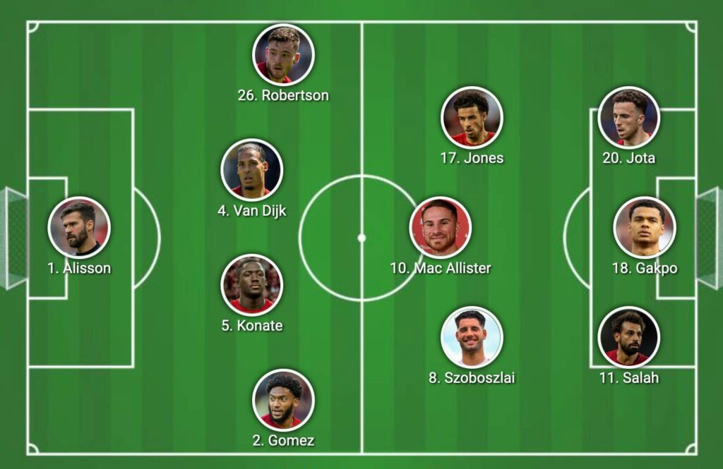 ကွင်းလယ်အတွက် လက်စ်ပွဲမှာ ပွဲထုတ်ထားတဲ့ ၃ ဦးလုံးကို အနားပေးပြီး မက်ကယ်လစ္စတာ၊ ဆိုဘိုစလိုင်၊ ကာတစ်ဂျုံးတို့ ၃ ဦးကို ပွဲထုတ်လာဖွယ် ရှိပါတယ်။ တိုက်စစ်အတွက်တော့ ဂျိုတာ၊ ဂက်ပို၊ ဆာလာတို့ ဖြစ်လာပါမယ်။