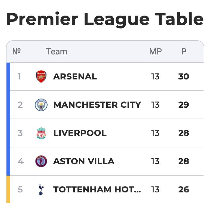 လက်ရှိမှာ အာဆင်နယ်က ပရီးမီးယားလိဂ် အမှတ်ပေးဇယားကို တစ်ကျော့ပြန် ဦးဆောင်ထားပြီး ဒုတိယမှာ မန်စီးတီး၊ တတိယမှာ လီဗာပူးတို့ ရှိနေကာ အမြင့်ဆုံး အမှတ်ကွာဟမှုက ၂ မှတ်ပဲ ရှိနေတာ ဖြစ်ပါတယ်။