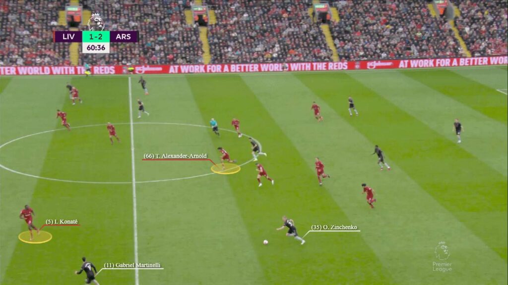 တောင်ပံနေရာကတစ်ဆင့် လီဗာပူးရဲ့ ဂိုးဧရိယာထဲကို ဖြတ်တင်ဘောတွေ မရောက်ရေး ဒါမှမဟုတ် တောင်ပံတောက်လျှောက် ထိုးဖောက်မှုကနေ တိုက်စစ်ဆင်ခြင်း မခံရရေးအတွက် ကိုနတေးနဲ့ ရိုဘိုတို့ဟာ အစွန်ဘက်ကို ဖြန့်ကစားချိန် ဖာဘင်ညိုနဲ့ ထရန့်တို့ အလယ်ကြောကနေ ခံစစ်ကို ဆင်းကူဖို့က အရေးပါလာနေတယ်။