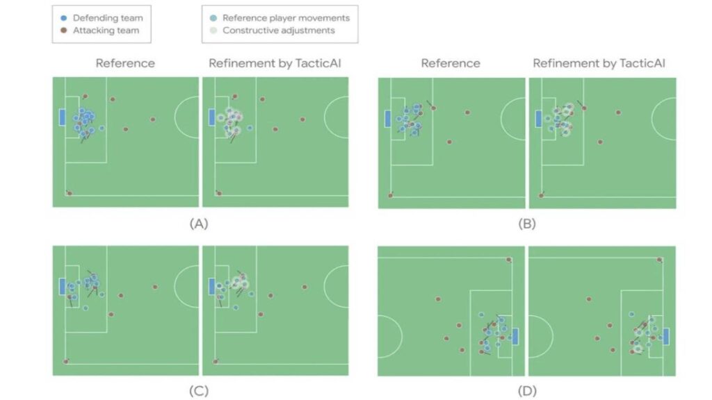 Google DeepMind ရဲ့ ထုတ်ကုန်ဖြစ်တဲ့ TacticAI ဟာ စက်ရုပ်အကူ အမျိုးအစားဖြစ်ပြီး ထောင့်ကန်ဘောက ပေးပို့လာမယ့် ဘောလုံး ဘယ်နေရာမှာ ကျမလဲဆိုတာမျိုးတွေကို တွက်ချက် ဖော်ပြနိုင်ပါတယ်။
