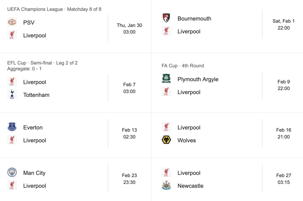 ဖေဖော်ဝါရီလမှာ လီဗာပူးအသင်းဟာ ကာရာဘောင်း ဆီမီးဖိုင်နယ် ဒုတိယအကျော့၊ အက်ဖ်အေဖလားနဲ့ ပရီးမီးယားလိဂ်ပွဲစဉ်တွေ ယှဉ်ပြိုင်ကစားရမှာပါ။ အသင်း ကစားရမယ့် ပွဲတွေထဲမှာ ဘုန်းမောက်၊ အဲဗာတန်၊ မန်စီးတီးတို့ကို အဝေးကွင်း ယှဉ်ပြိုင်ကစားရမယ့် အမှတ်ပေးပွဲတွေ ပါဝင်နေပါတယ်။