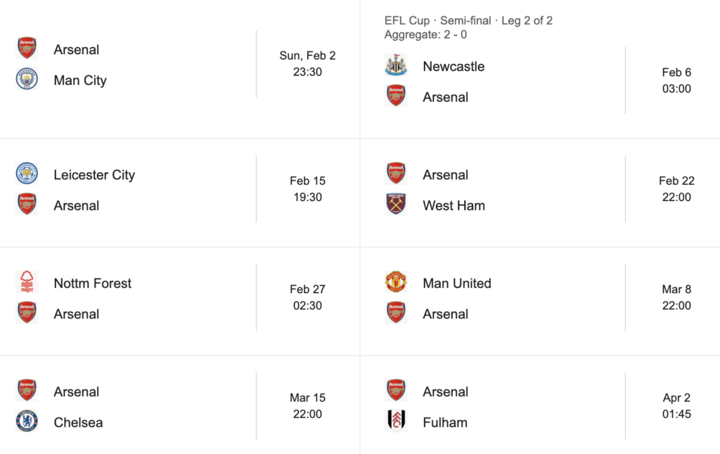 တစ်ဖက်မှာ အာဆင်နယ်ဟာလည်း ဖေဖော်ဝါရီလ အစမှာတင် မန်စီးတီးနဲ့ ယှဉ်ပြိုင်ကစားဖို့အပြင် ဖောရက်စ်ကို အဝေးကွင်းသွားရောက် ယှဉ်ပြိုင်ရဖို့ရှိနေပါတယ်။ အာတီတာရဲ့ အသင်းဟာ အက်ဖ်အေဖလားကနေ ပြုတ်ခဲ့ပြီဖြစ်ကာ ပွဲကျန်လည်း မရှိတာမို့ လီဗာပူးထက်စာရင် ပွဲချိန် ပိုအနားရဖို့ ရှိပါတယ်။