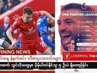 ချယ်ဆီးအသင်းကို မိုဆာလာ၊ ကာတစ်ဂျုံးတို့ရဲ့ သွင်းဂိုးတွေဖြင့် အနိုင်ရတဲ့နောက် လီဗာပူးအသင်းဟာ အမှတ်ပေးဇယား ထိပ်ဆုံးကို ပြန်တက်သွားပါပြီ။ သွင်းဂိုး ၁၆၀ နဲ့ ဂိုးထောက်ပံ့မှု ၇၂ ကြိမ် လုပ်နိုင်တဲ့နောက် ပရီးမီးယားလိဂ်မှာ မိုဆာလာထက် ပိုပြီး သွင်းဂိုးအတွက် ပါဝင်ပတ်သက်ထားနိုင်သူဟာ ၅ ဦးပဲ ကျန်ရှိပါတော့တယ်။ ကာတစ်ဂျုံးကတော့ […]